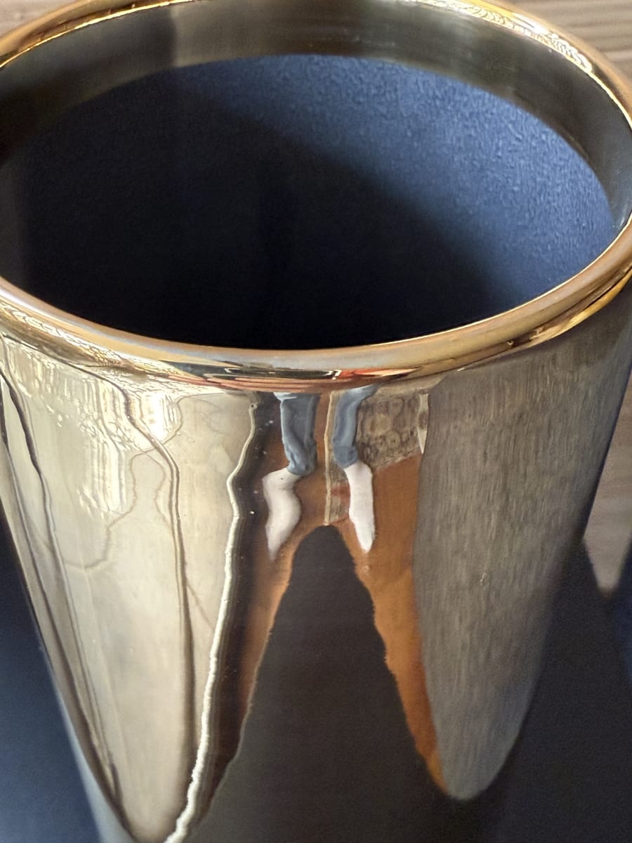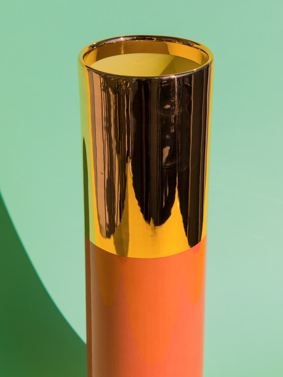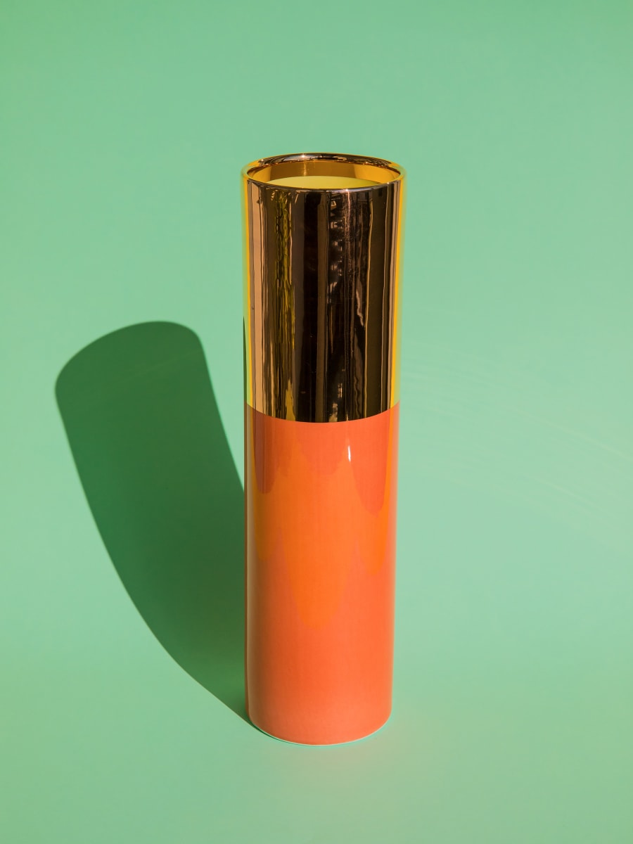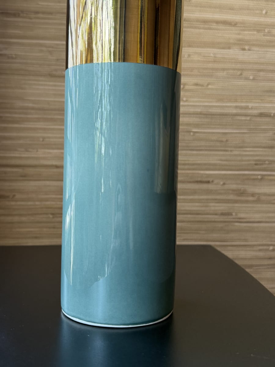 Florero cilíndrico realizado en arcilla blanca. Decorado con esmalte bicolor y oro 24K.