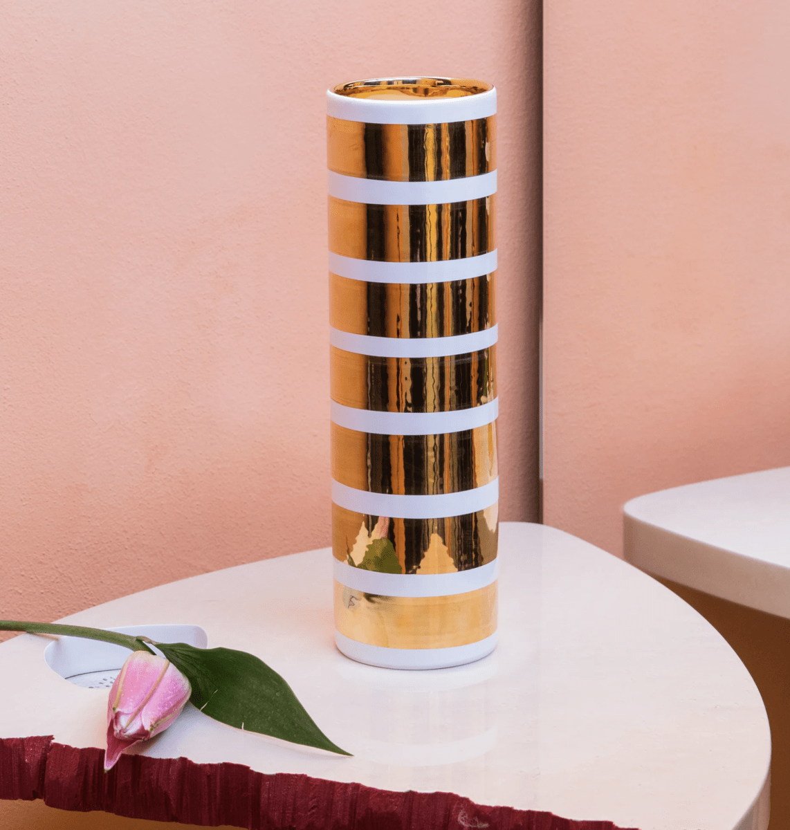 Florero cilíndrico realizado en arcilla blanca. Decorado con esmalte unicolor y oro 24k _ platino _ cobre.