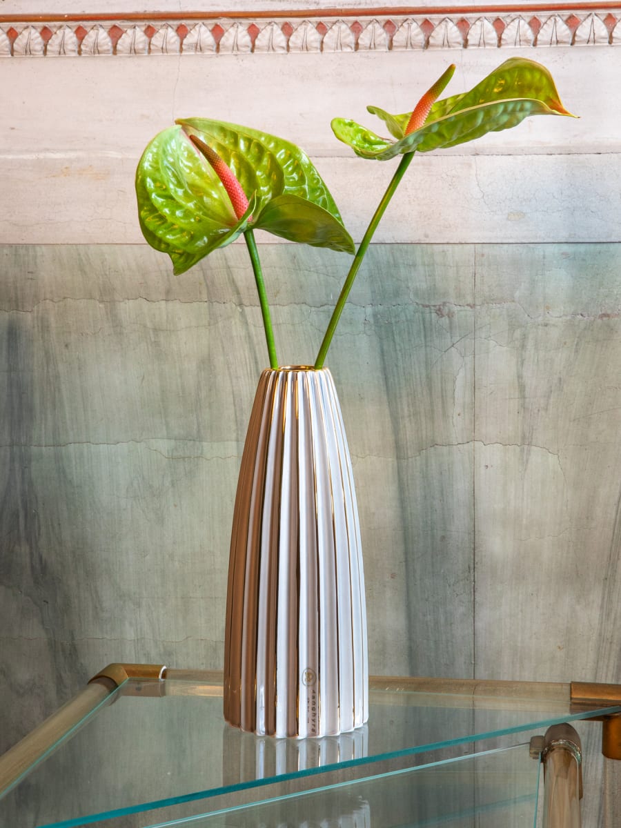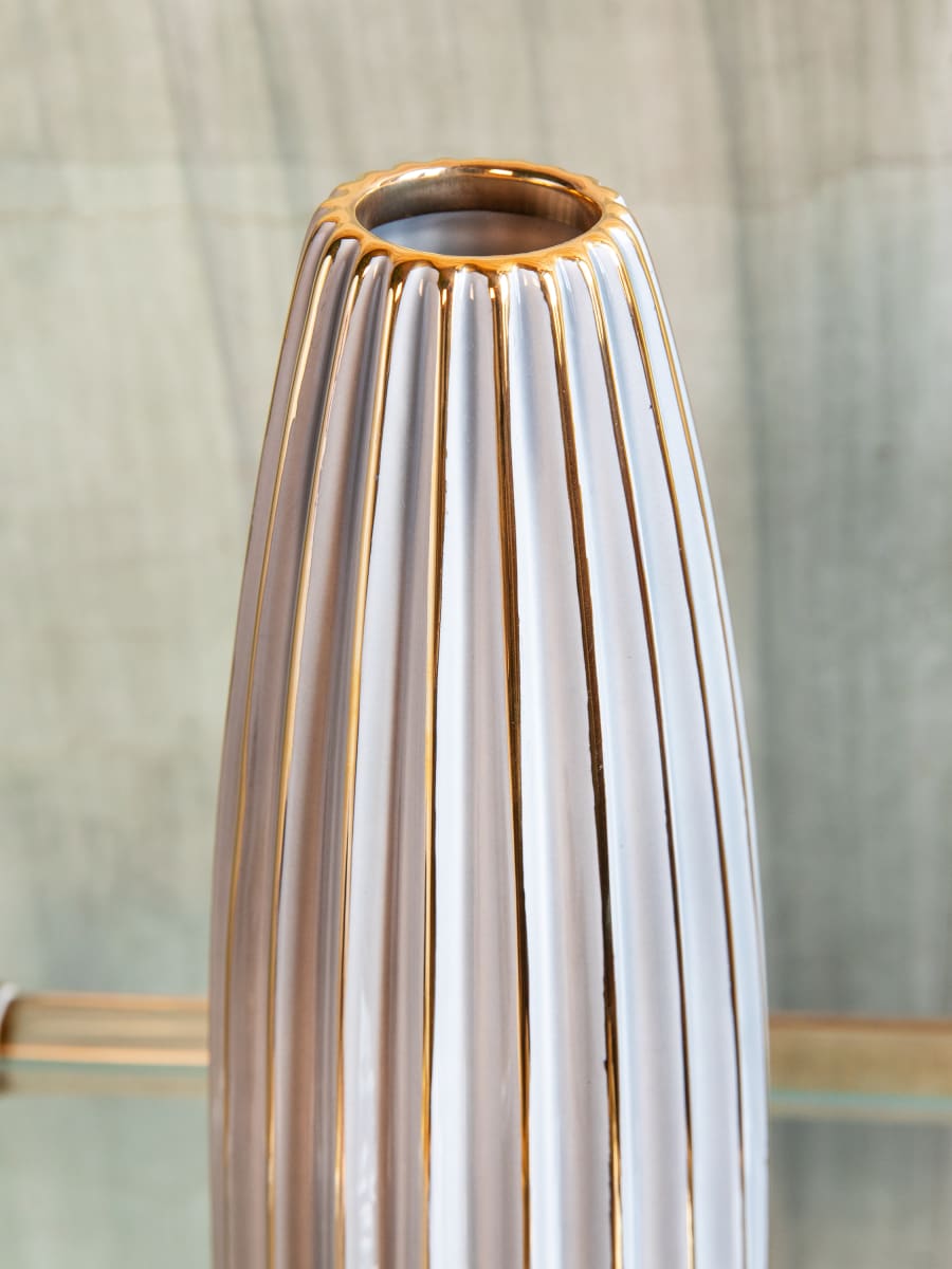 Florero realizado en arcilla blanca. Decorado con esmalte unicolor y oro 24K.