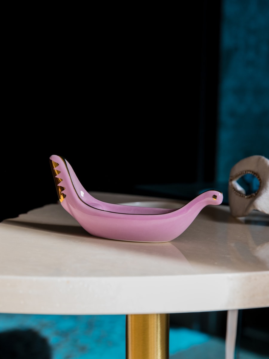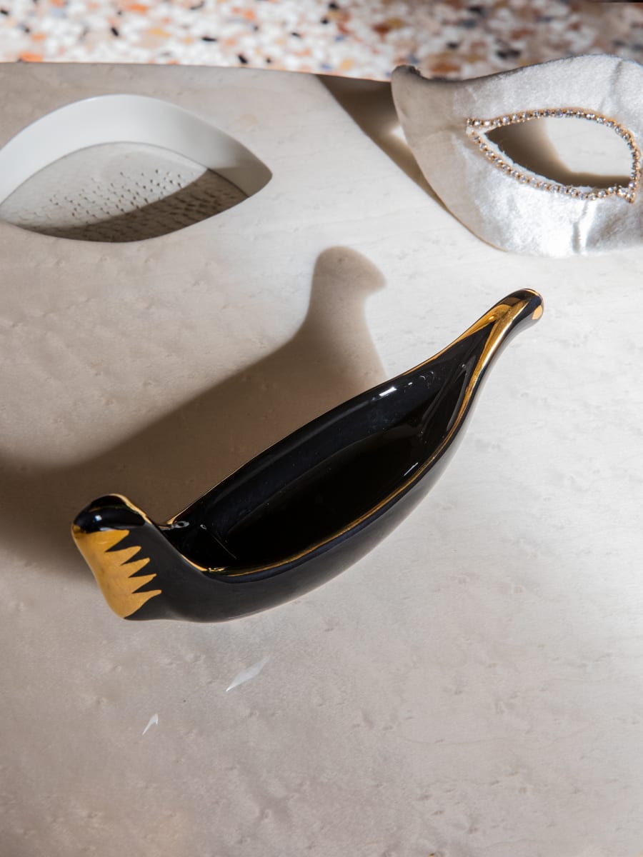 Góndola que se desplaza por el canal veneciano realizada en arcilla blanca. Decorado con esmalte unicolor y oro 24K.