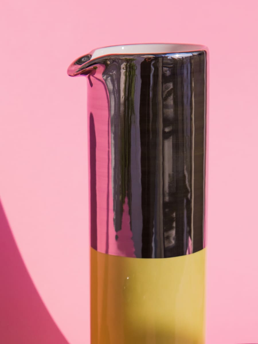 Jarra cilíndrica realizada en arcilla blanca. Decorado con esmalte bicolor y platino.