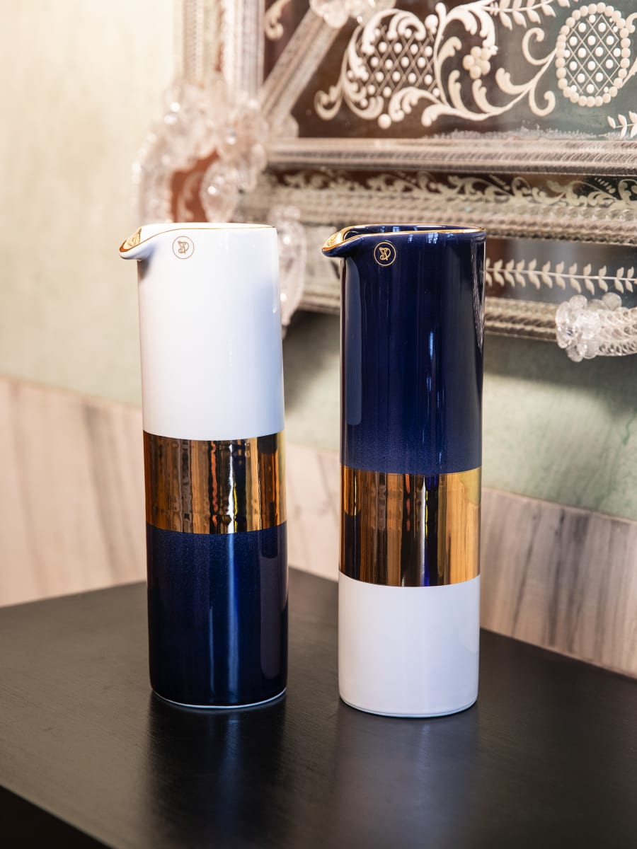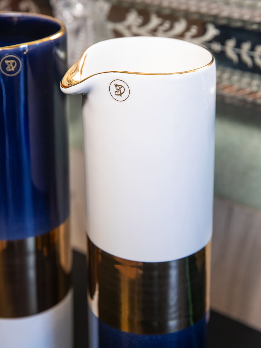 Jarra cilíndrica realizada en arcilla blanca. Decorado con esmalte bicolor y oro 24K.