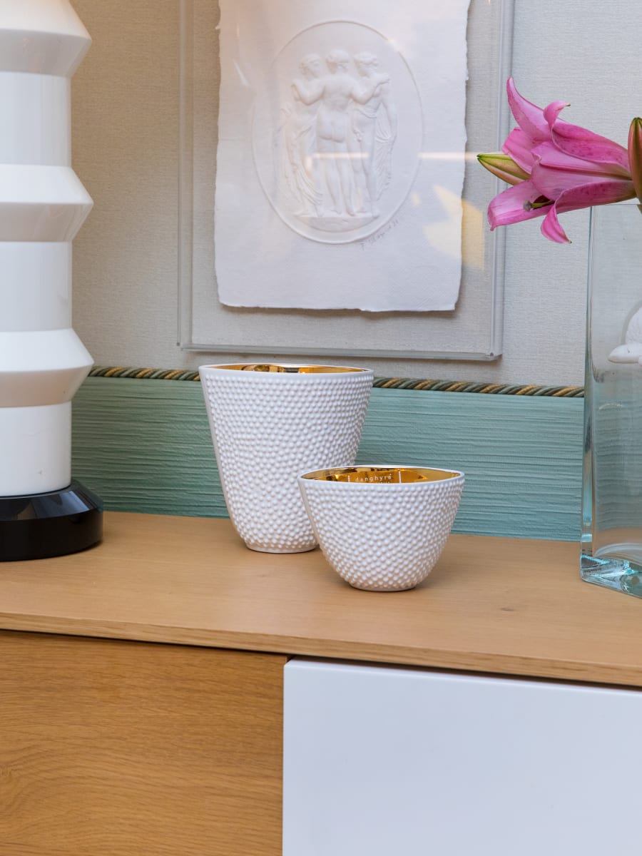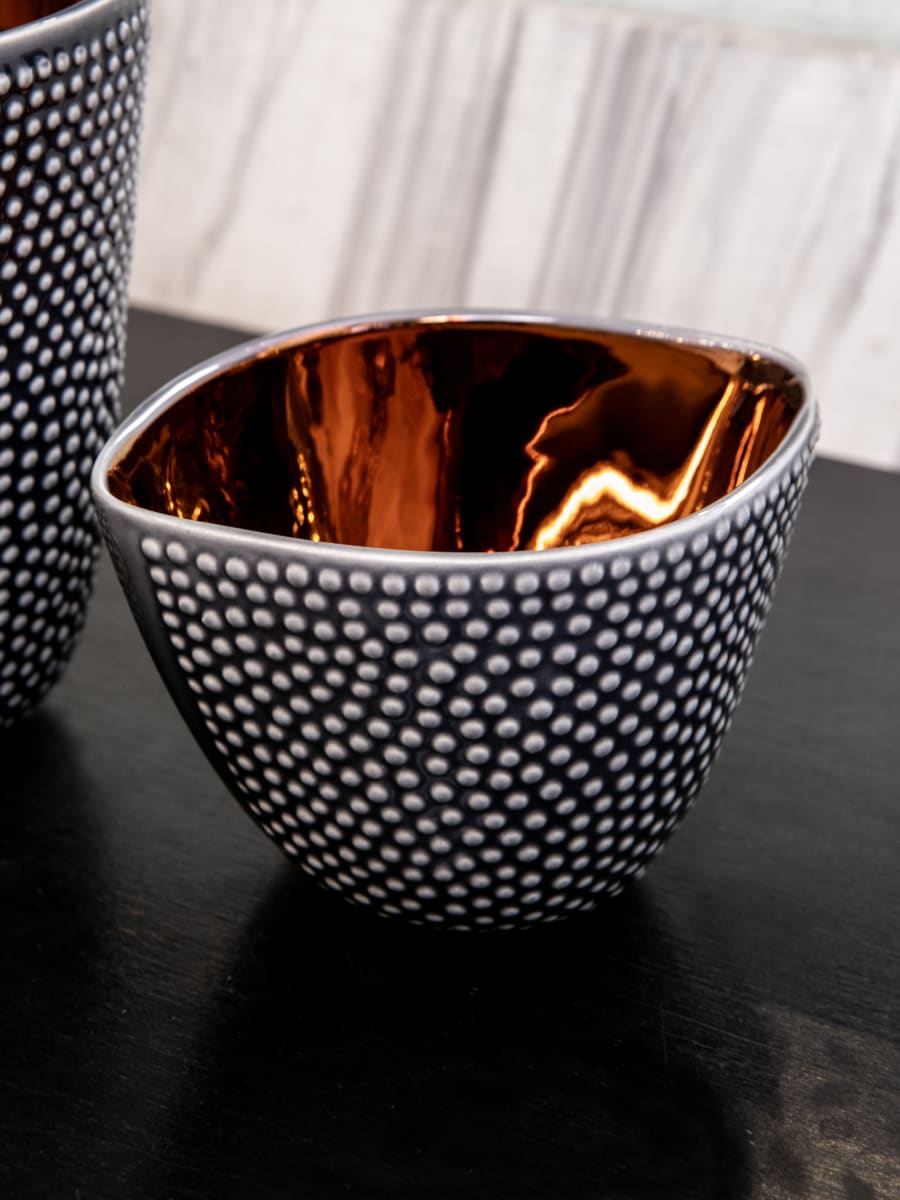 Conjunto compuesto por dos Jarras realizadas en arcilla blanca. Decorado con esmalte en unicolor y oro 24K_cobre