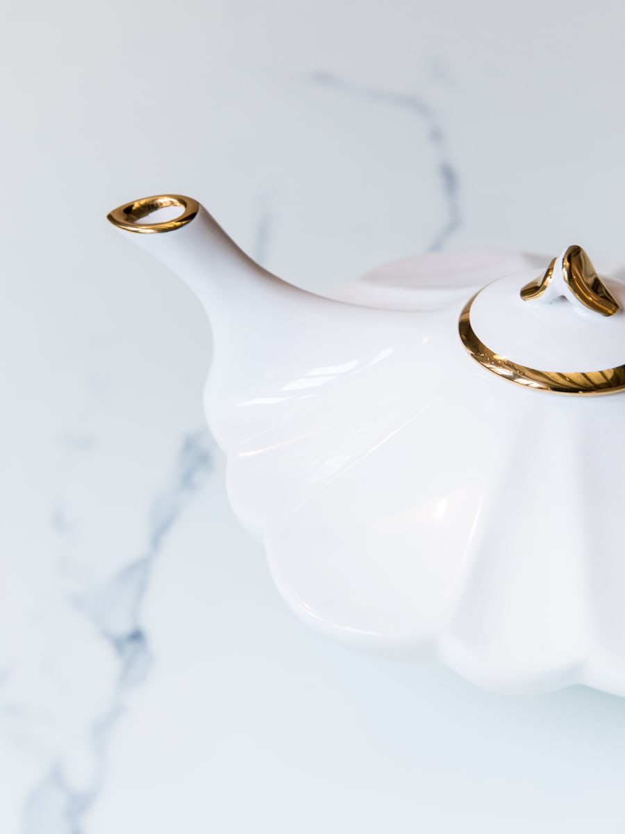 Set de té compuesto por Tetera Pétalo, un azucarero y 2 tazas de té pétalo blancas, elaborados en arcilla blanca. Decorado con esmalte unicolor y oro 24K.