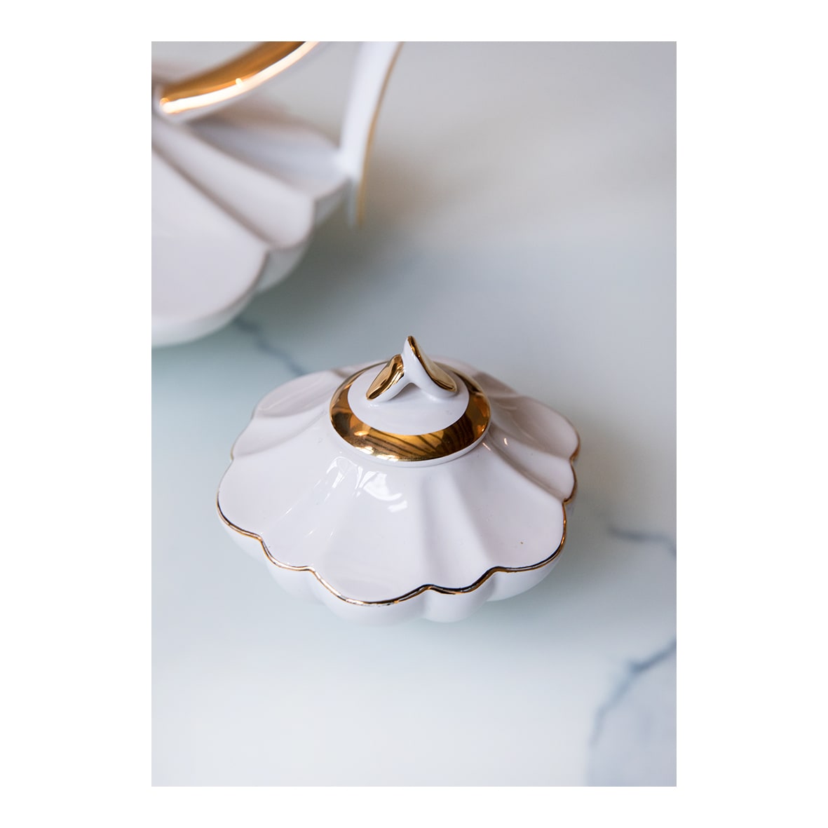 Juego Tetera + Azucarero + 2 Tazas Blancas "Pétalo" Blanco / Oro