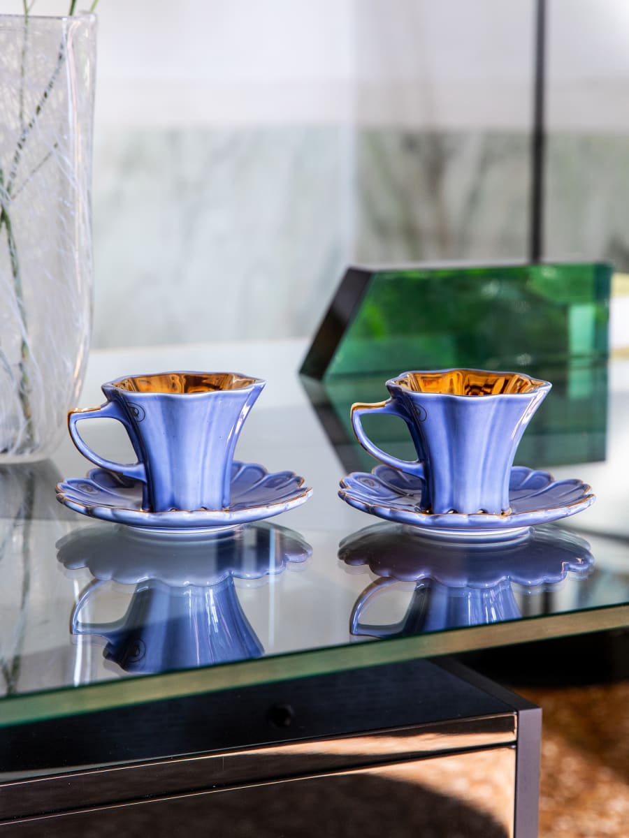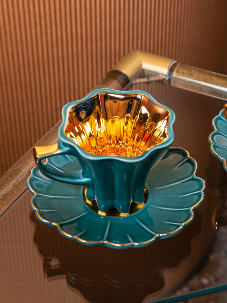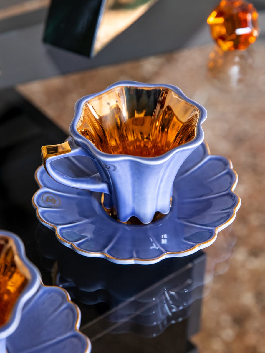 Taza de té y platillo elaborados en arcilla blanca. Decorado con esmalte unicolor y oro 24K.