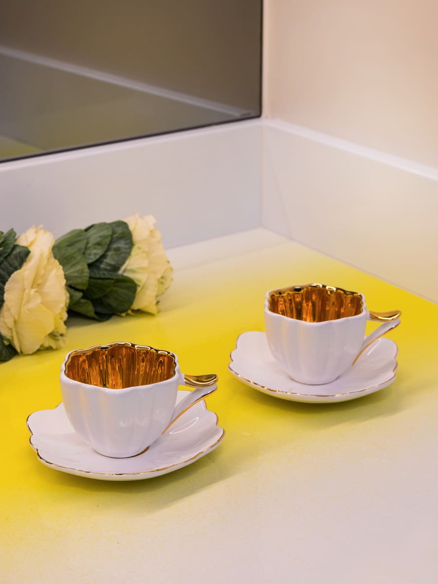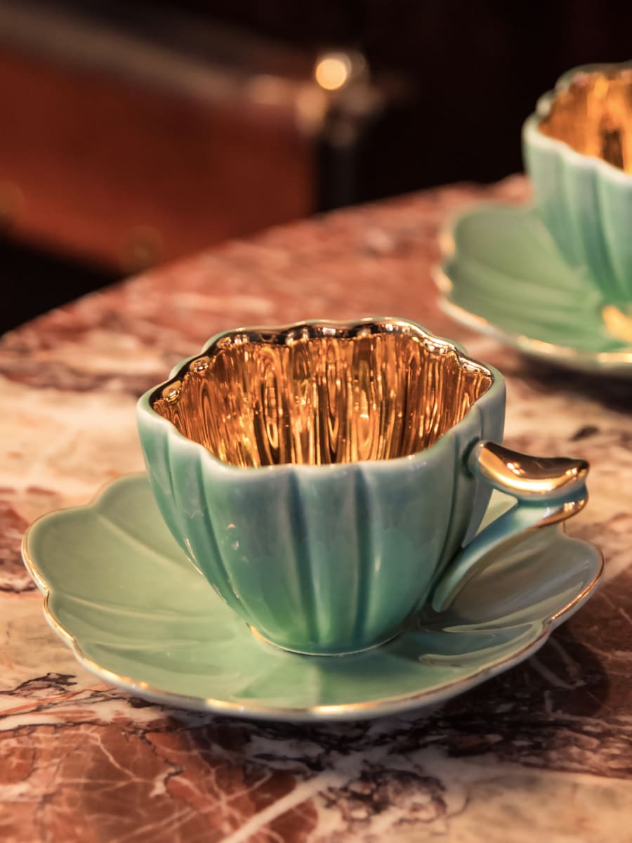 Taza de té y platillo elaborados en arcilla blanca. Decorado con esmalte unicolor y oro 24K.