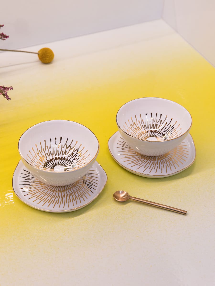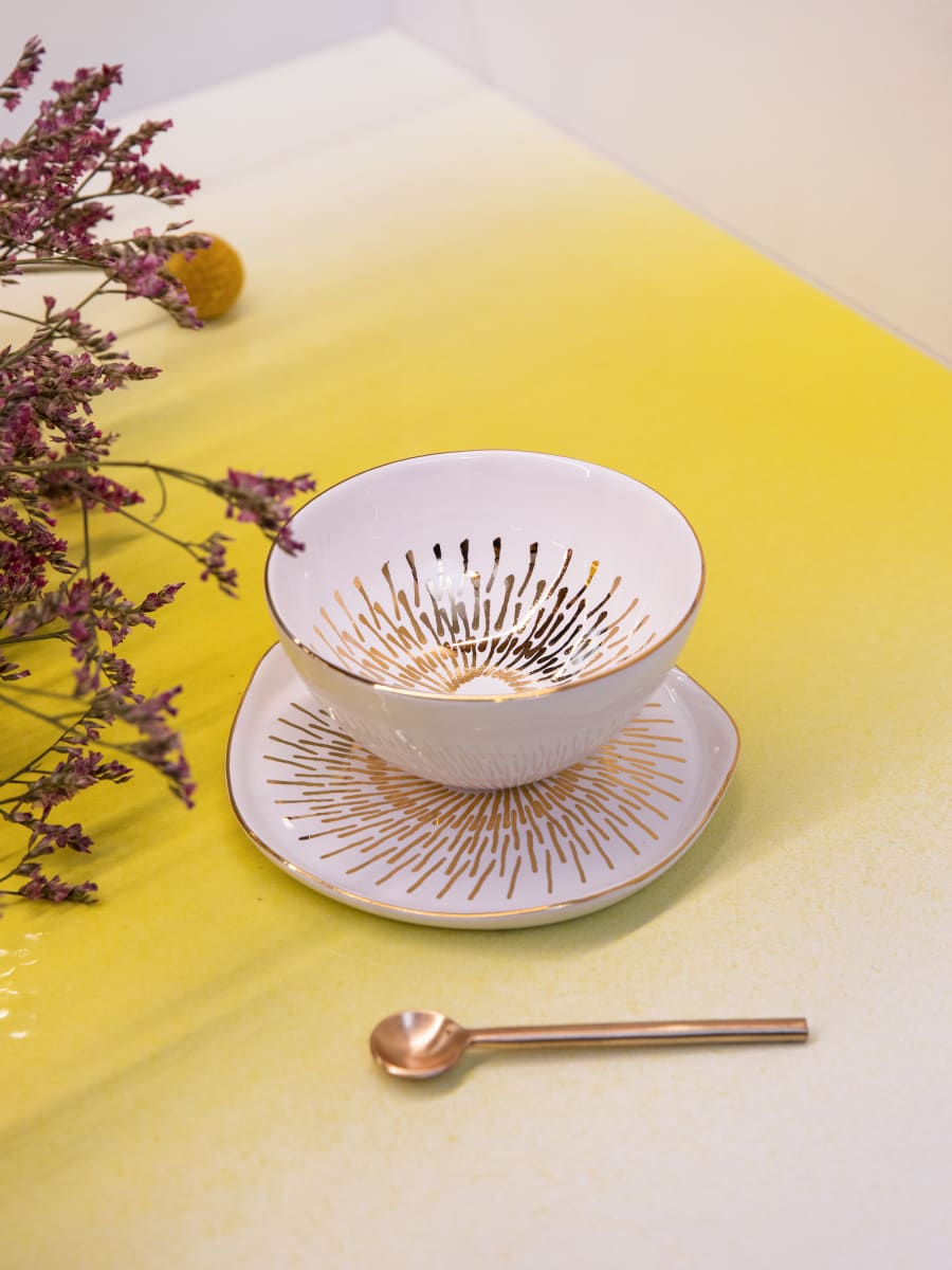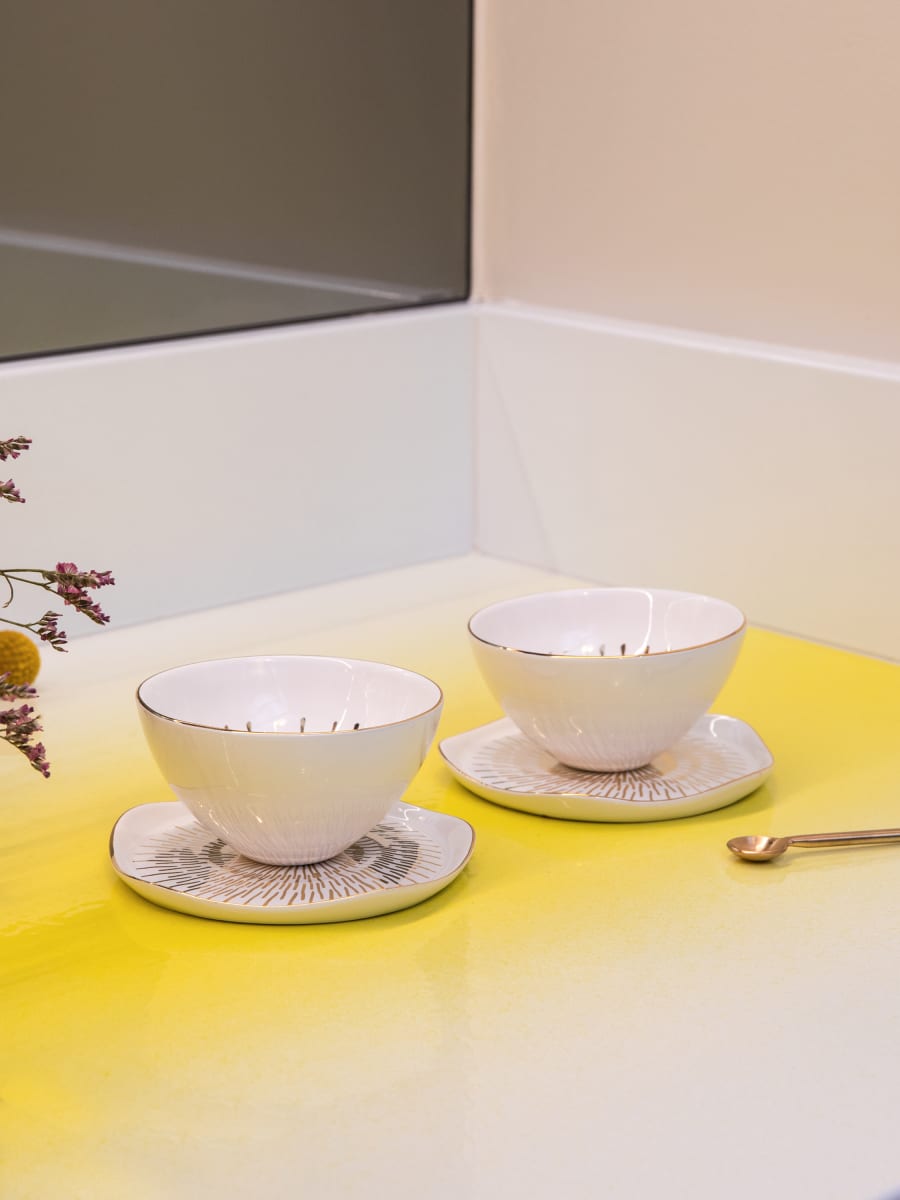 Taza de té y platillo elaborados en arcilla blanca. Decorado con esmalte unicolor y oro de 24K.