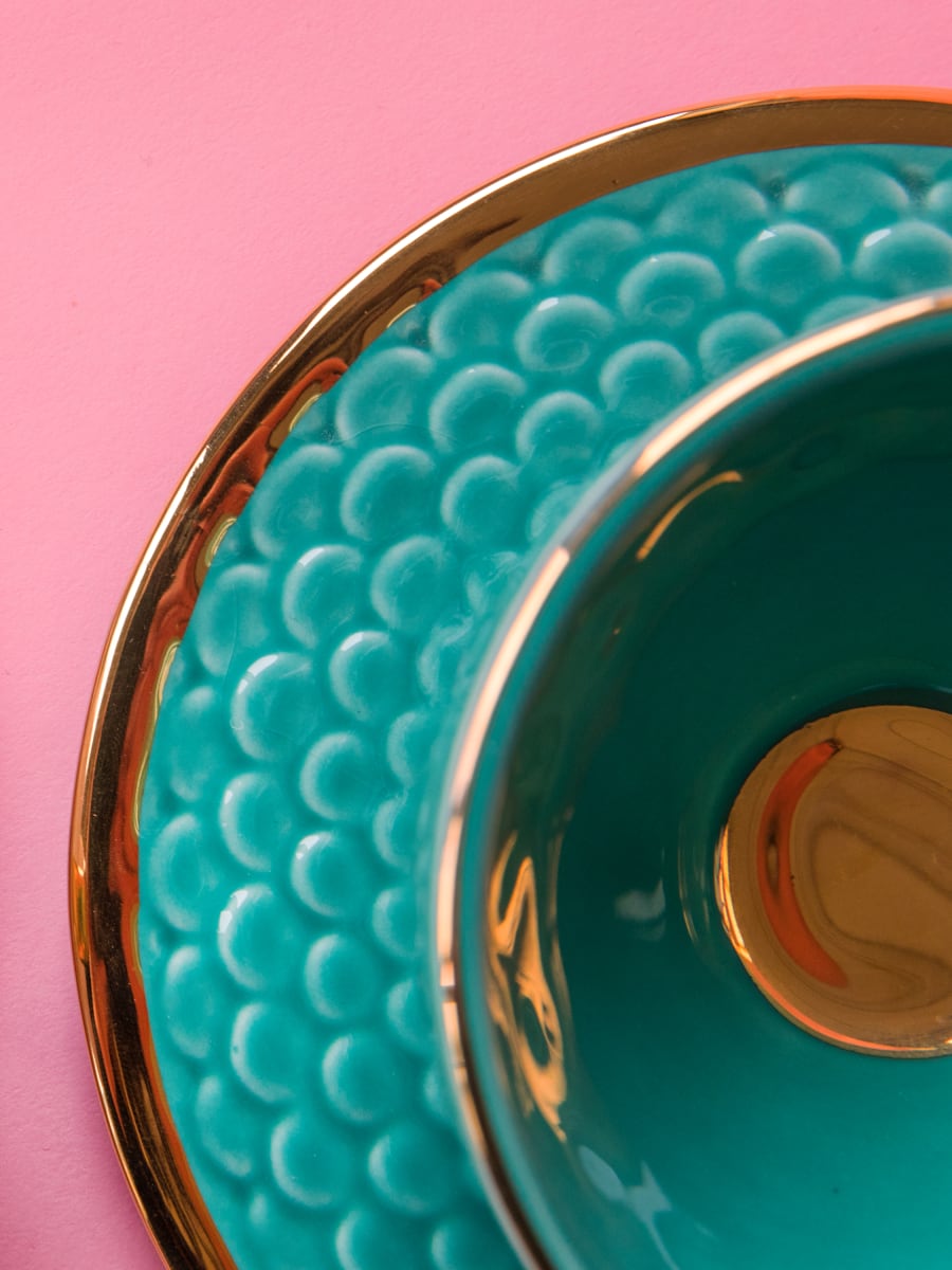 Taza de té y platillo elaborados en arcilla blanca. Decorado con esmalte unicolor y oro 24K.