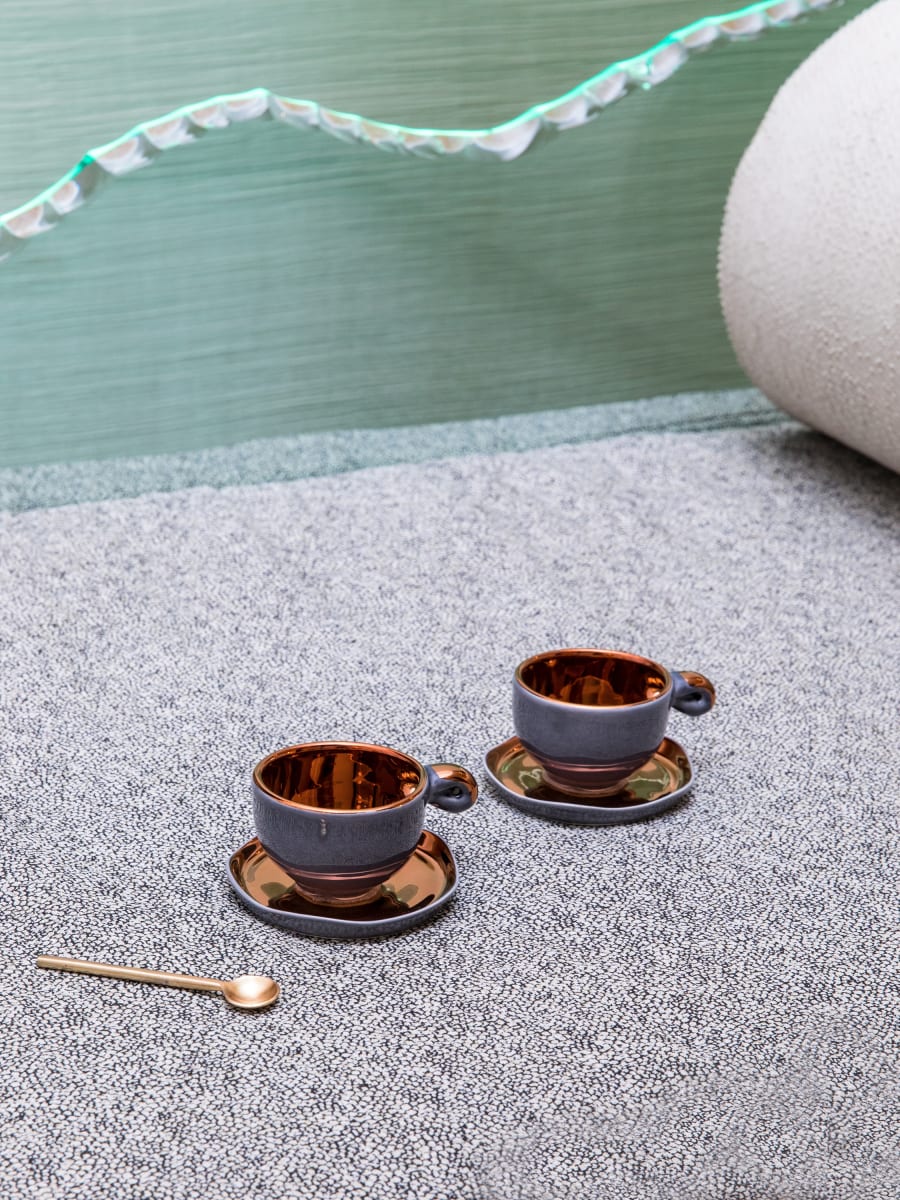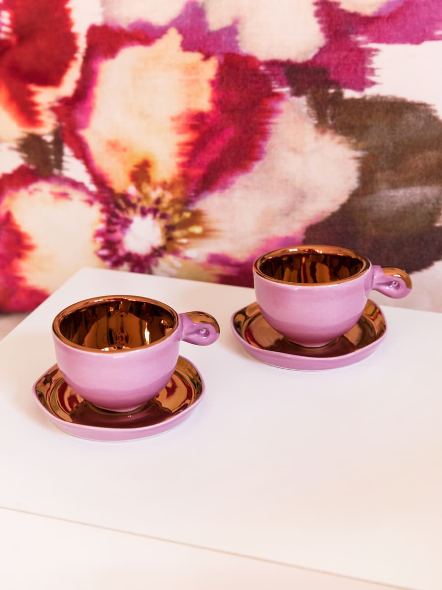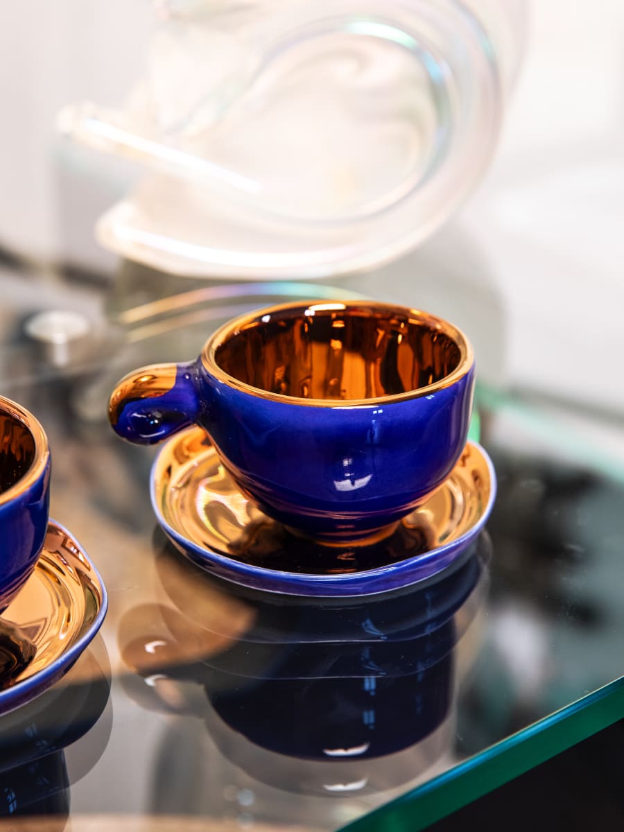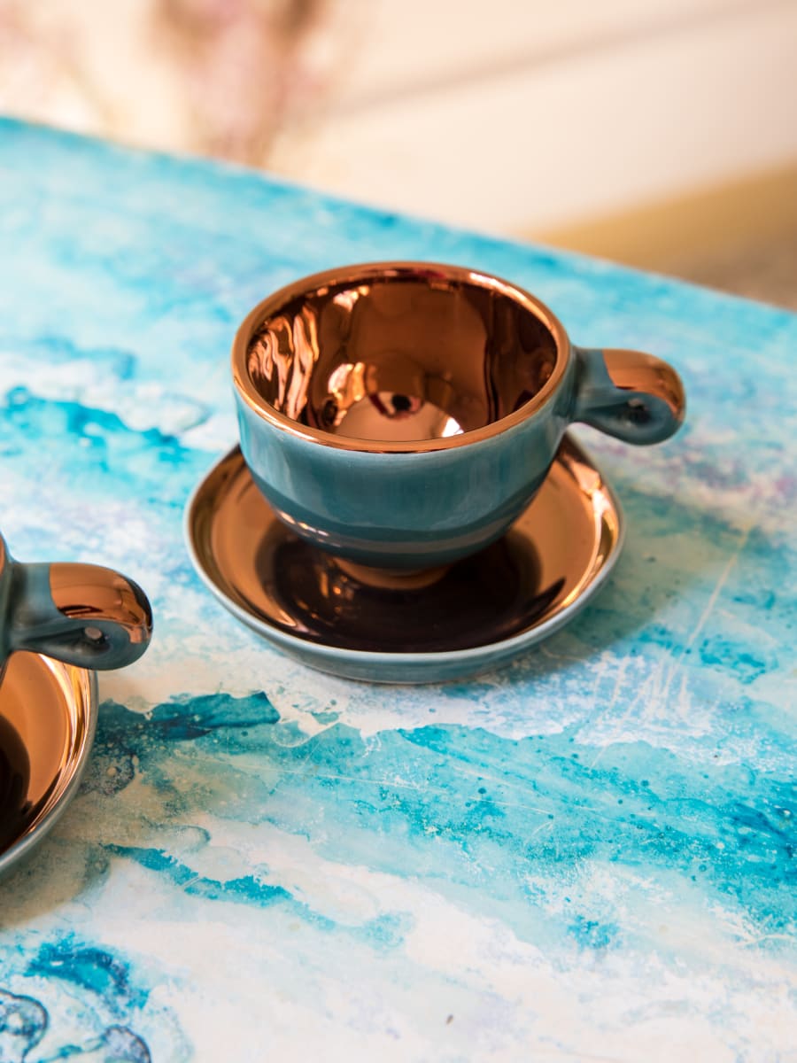 Taza de espresso y platillo elaborados en arcilla blanca. Decorado con esmalte monocolor y cobre.
