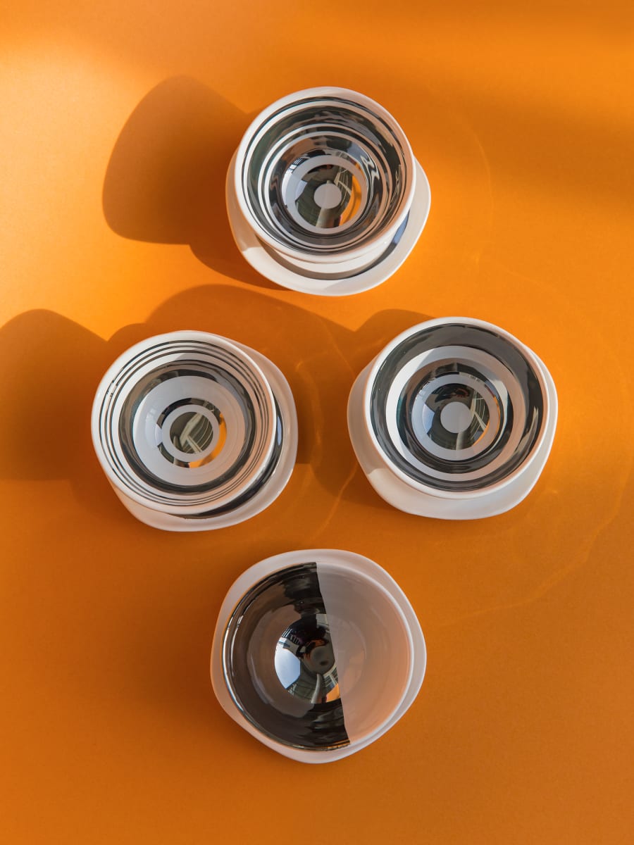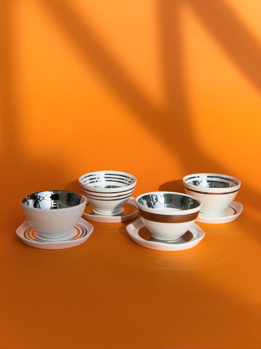 Juego de cuatro tazas y platillos de café realizados en arcilla blanca. Decorado con esmalte unicolor y oro 24K _ platino.