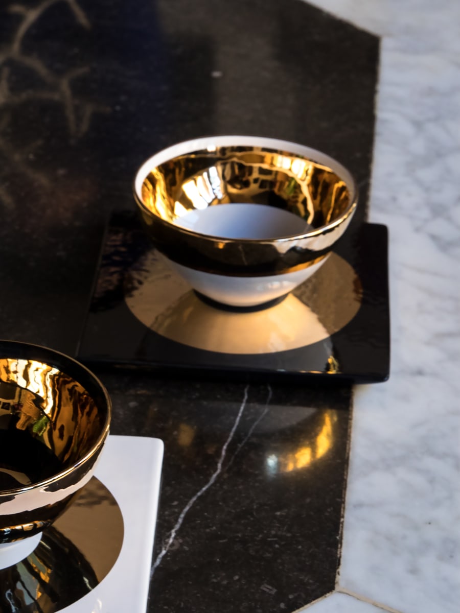 Tazas de Té & Platillo Cuadrado "Linea" 2 uds. Blanco / Negro / Oro