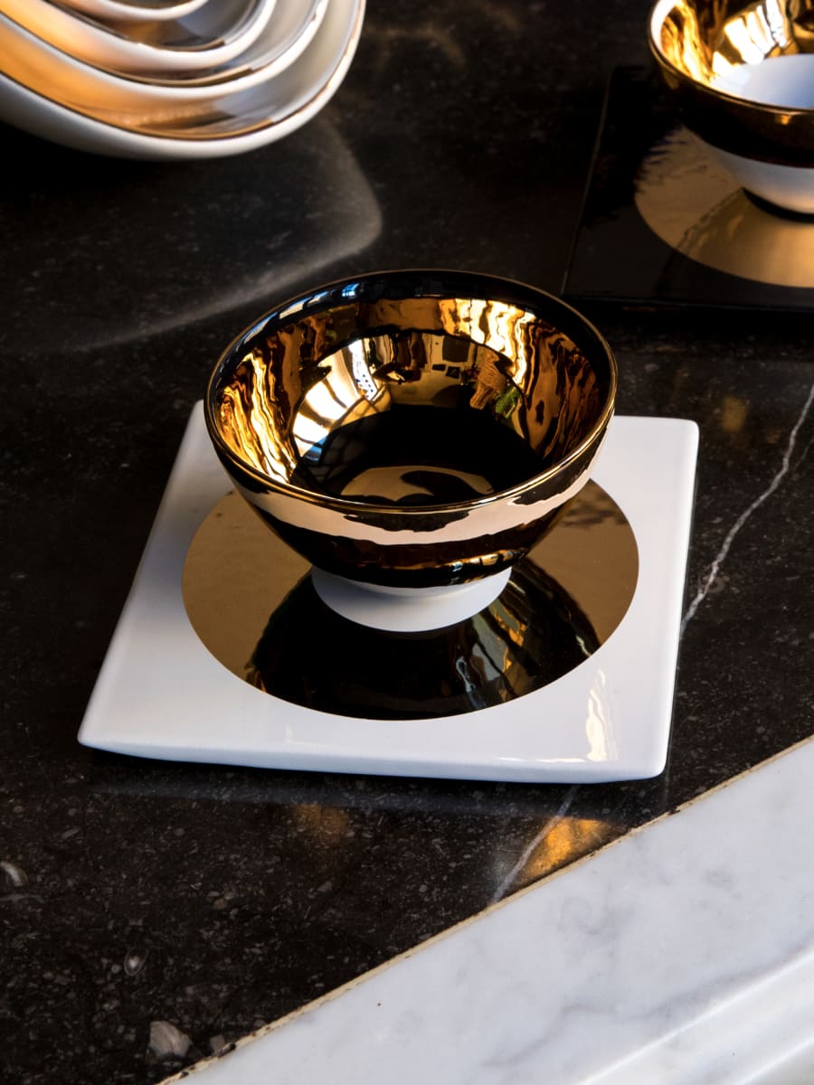 Juego de dos tazas y platos cuadrados para té elaborados en arcilla blanca. Decorado con esmalte unicolor y oro 24K.
